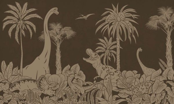 Een prehistorisch landschap met gedetailleerde dinosaurussen tussen weelderige tropische planten. De diepblauwe achtergrond versterkt de dramatische, vintage uitstraling, terwijl de beige silhouetten van de dinosaurussen zorgen voor een dynamisch contrast.