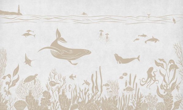 Een sereen onderwaterlandschap met walvissen, roggen en andere zeedieren in zachte beige tinten. Het ontwerp vangt de rust van de oceaan met minimalistische details, subtiele koralen en schaduwen die een verfijnde sfeer creëren.