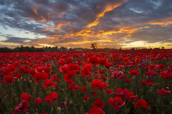 Een mooie afbeelding van een rode Klaprozenveld met een gedetailleerde oranje blauwe lucht op de achtergrond.