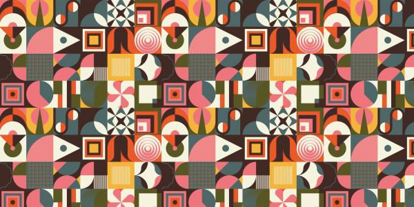 Een grafische afbeelding van kleurrijke abstracte vormen. Combineer dit in bijvoorbeeld de eetkamer.