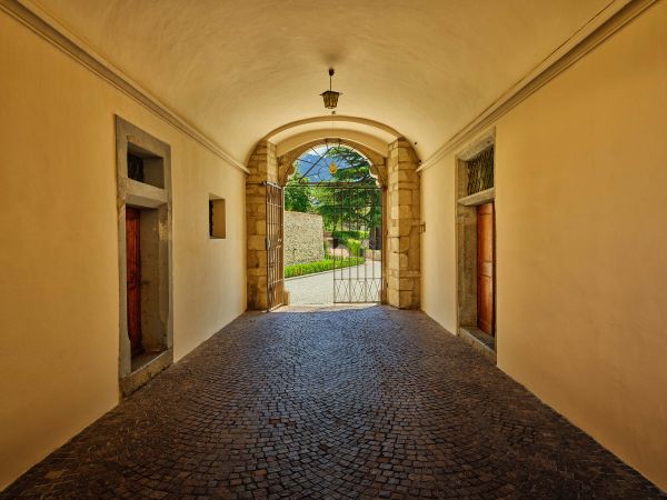 Doorgang in een klooster op een zonnige dag. Met dit fotobehang in huis is het net alsof je de gang in kan lopen.