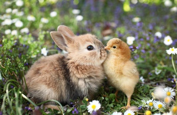 Dit schattige konijntje zit samen met een kuikentje in een bloemenveld.
