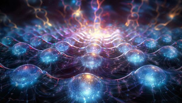 Dit hypnotiserende beeld van gloeiende, netwerkvormige sferen roept het beeld op van een complex kosmisch netwerk of de interstellaire verbindingen van een neuronaal landschap.
