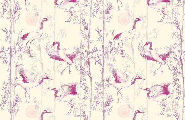 Kraanvogels en bamboe. Deze print is gemaakt met waterverf en heeft roze tinten.