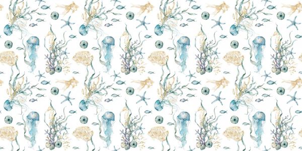 Dit patroon is een lyrische compositie van zeeleven, geschilderd in zachte waterverfkleuren. De vloeiende kwallen en delicate vissen dansen tussen koraal en zeewier, een visueel gedicht dat de vredige symfonie van de oceaan eert.