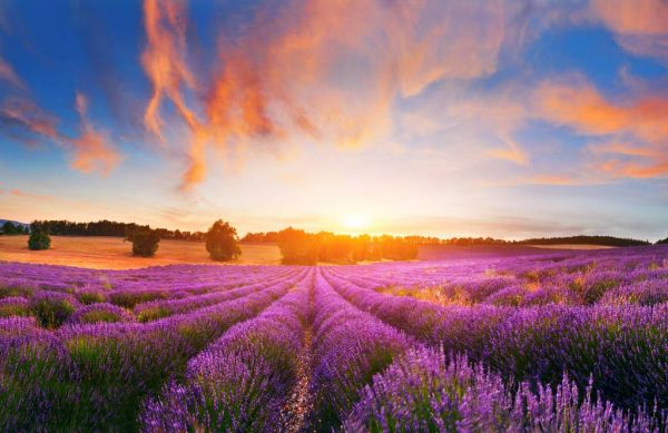Een veld vol met lavendel bloemen in volle bloei. Op de achtergrond een ondergaande zon wat zorgt voor een schilderachtige afbeelding.
