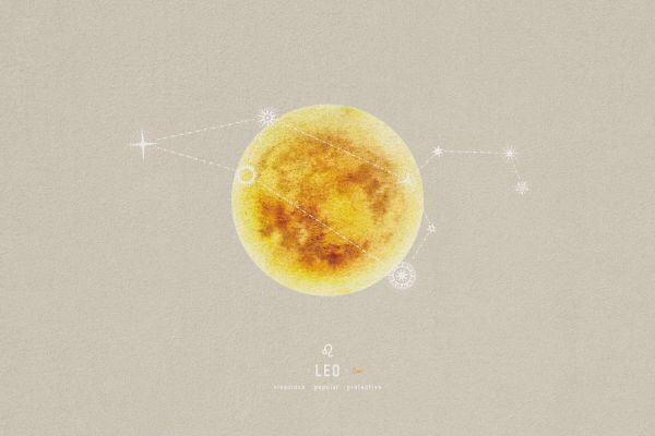 Een stralende aquarelillustratie van de zon in levendige geel- en oranjenuances, omlijst door het sterrenbeeld Leeuw. De compositie ademt warmte, kracht en een speelse grandeur.