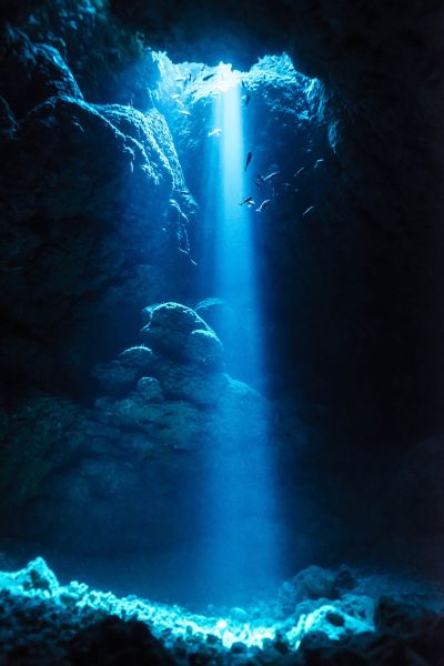 Portretfoto van een grot diep in de zee. Door de zonnestralen zijn de zwemmende vissen goed te zien.