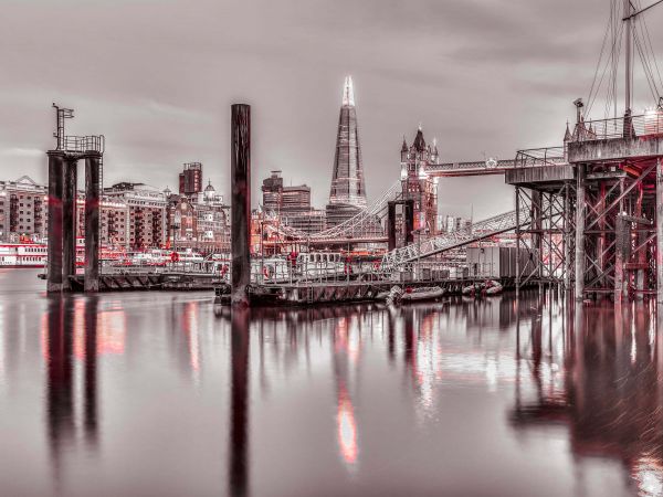 Londen tijdens de avond. De roden lichten in de stad vallen goed op.
