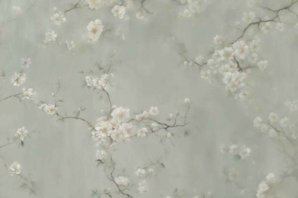 Dit verfijnde ontwerp brengt de rustgevende schoonheid van bloeiende takken tot leven. De zachte, grijsgroene achtergrond creëert een kalme en serene sfeer, terwijl de delicate witte bloesems en sierlijke takken zorgen voor een tijdloze en elegante uitstraling. De subtiele aquareleffecten geven het ontwerp een lichte en dromerige touch, waardoor het perfect past in zowel klassieke als moderne interieurs.