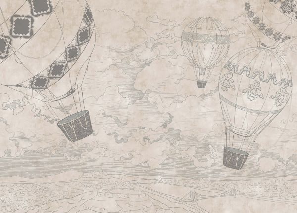 Luchtballonnen met een uitzicht boven de stad. Dit behang heeft een oud effect over zich heen wat zorgt voor een prachtige kamer.