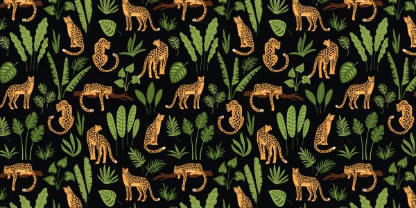 Een luipaard patroon met bladeren op een zwarte achtergrond.