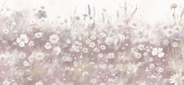 Een romantische bloemenweide in gedempte roze tinten met subtiele witte accenten. De aquareleffecten geven een zachte en dromerige uitstraling, perfect voor een verfijnd en sfeervol interieur.