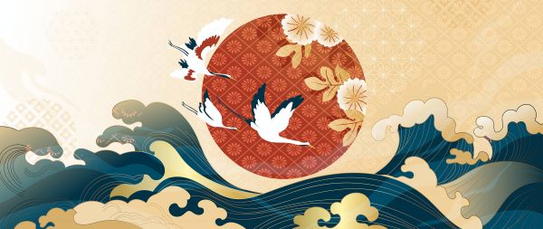 Een luxe zonsondergang met vliegende kraanvogels. Door de warme kleuren brengt dit fotobehang een warme sfeer in huis.