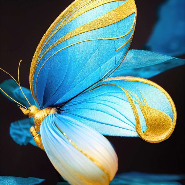 Een sierlijke vlinder in helderblauw met gouden accenten spreidt zijn vleugels op elegante wijze. De fijne details en zijdeachtige textuur geven het beeld een luxueuze, dromerige uitstraling.