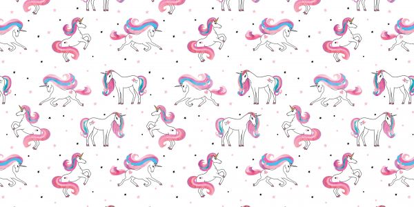 Verschillende magische unicorns met regenboog manen op een patroon.