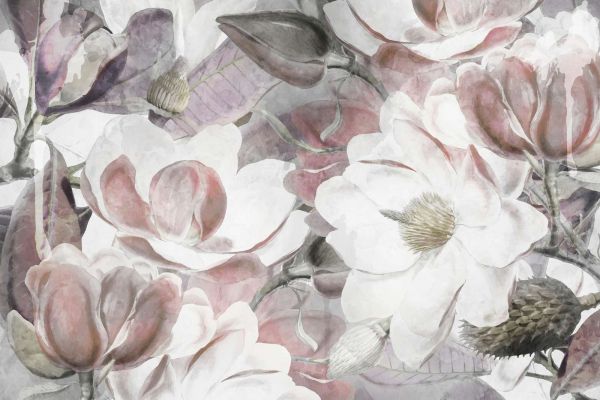 Een delicate weergave van magnolia's met grote, weelderige bloemblaadjes in zachte tinten. De subtiele aquarelstijl geeft een elegante en tijdloze uitstraling, perfect om een rustgevende sfeer te creëren.