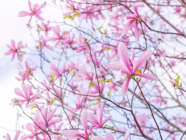 Magnolias van onderen gefotografeerd tijdens een zonnige dag. Combineer dit fotobehang in de kamer voor nog meer sfeer.