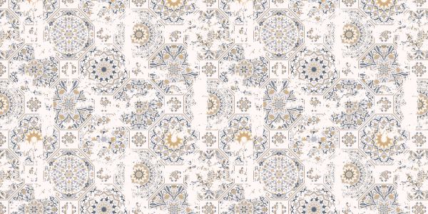 Deze sierlijke compositie van zeshoekige tegels is bezaaid met symmetrische, Marokkaans geïnspireerde patronen, badend in een zacht palet van oker, grijs en ivoor.
