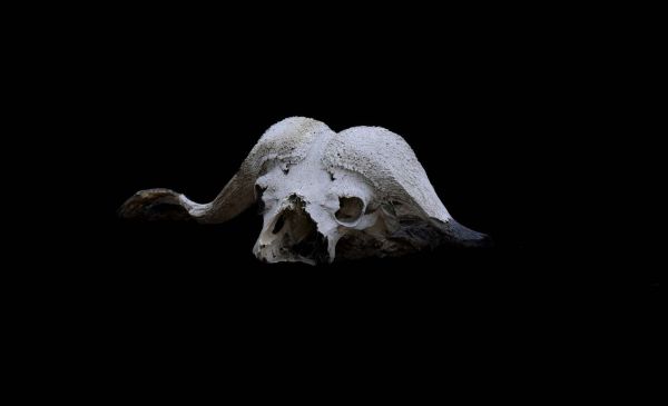 Deze indrukwekkende compositie toont een verweerde buffelschedel met sierlijk gebogen hoorns, scherp uitgelicht tegen een diepzwarte achtergrond. De lichte, poreuze structuur van het bot contrasteert intens met de duisternis, waardoor elk detail van slijtage en textuur zichtbaar wordt. Het beeld straalt rust, kracht en een vleugje mysterie uit.
