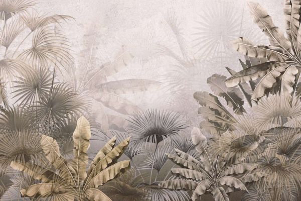 Dit verfijnde botanische ontwerp brengt de serene schoonheid van een tropisch landschap naar voren met een zachte, nevelige uitstraling. De gelaagde palmen en bananenbladeren in warme aardetinten zorgen voor een subtiel, natuurlijk contrast tegen de lichte, textuurachtige achtergrond. De combinatie van vervaagde silhouetten en gedetailleerde bladeren creëert diepte en een rustgevend visueel effect, perfect voor een tijdloos en stijlvol interieur.