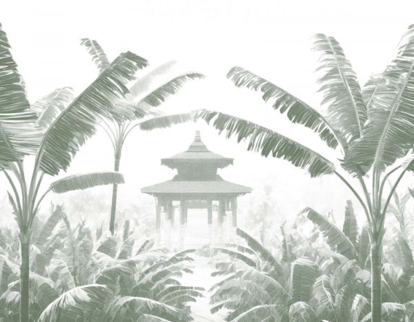 Deze betoverende afbeelding toont een Aziatische tempel die subtiel verborgen ligt tussen weelderige, door de wind bewogen palmbomen. Het geheel is gehuld in een zachte mist, waardoor een serene en bijna mystieke sfeer ontstaat.