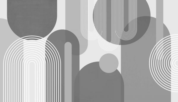 Een samenspel van grijze tinten en witte lijnen creëert een gestructureerde symmetrie in dit moderne ontwerp. De variatie in vorm en de precisie van de lijnen zorgen voor een rustige maar intrigerende visuele ervaring.