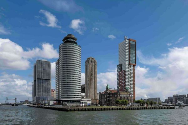 Deze prachtige stadsweergave toont de Rotterdamse Kop van Zuid in al haar glorie, met een perfecte balans tussen historische charme en moderne architectuur. Op de voorgrond schittert de Maas, terwijl de imposante hoogbouw, waaronder De Rotterdam en Montevideo, trots boven de kade uittorent. Het iconische Hotel New York voegt een nostalgisch en karakteristiek element toe aan het stadsbeeld, een herinnering aan het maritieme verleden van Rotterdam.