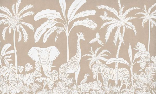 Een exotisch landschap vol wilde dieren zoals olifanten, giraffen, zebra’s en apen, omlijst door weelderige tropische planten. De zachte kleur op de achtergrond en illustraties geven het geheel een serene uitstraling.