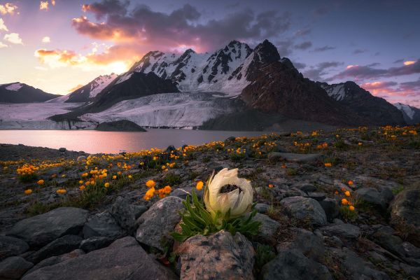 Morning at Saussurea op fotobehang. Een besneeuwde berg bij een meer met bloemen en prachtige lucht.