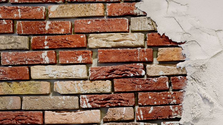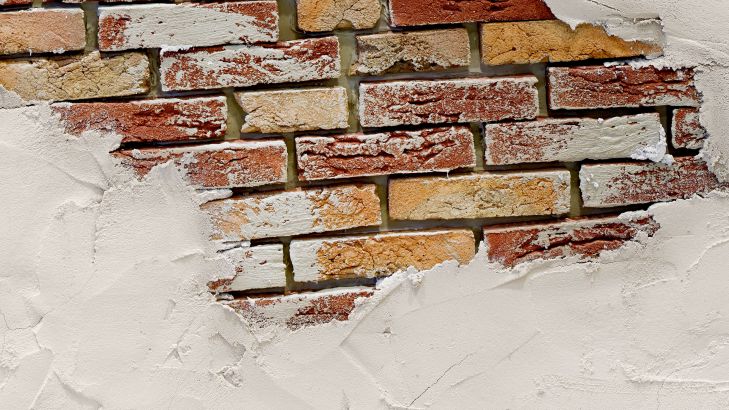 Muur met stucwerk en bakstenen. Maak van jouw saaie ruimte een unieke ruimte met dit fotobehang.