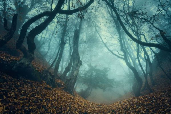 Fotobehang van een mysterieus bos vol met bladeren op de grond en een dichte mist.