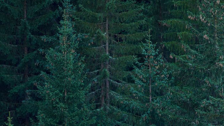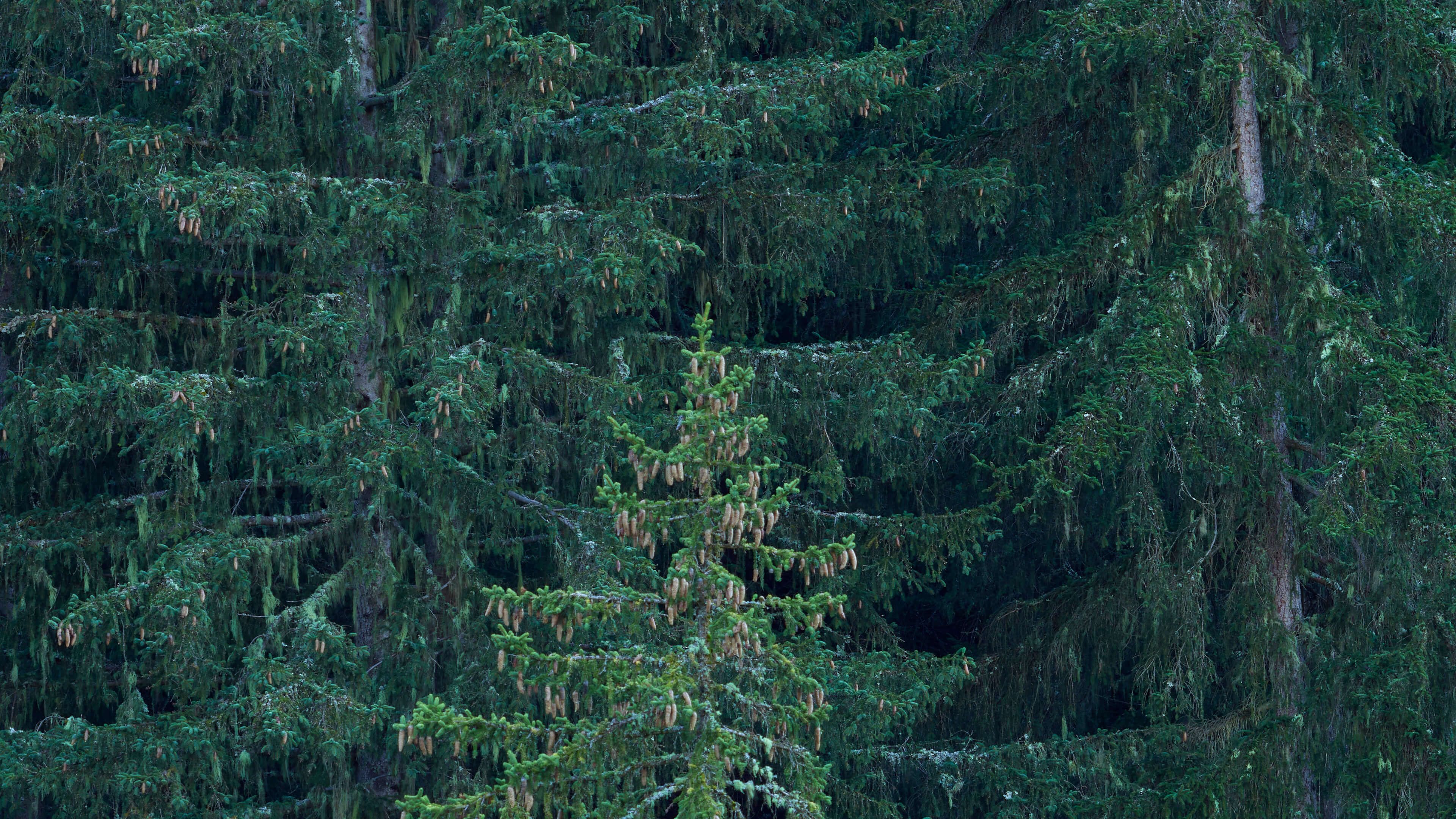 Naaldbomen met dennenappels op een berg. Combineer dit fotobehang in jouw woning en creëer nog meer sfeer in de kamer.
