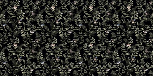 De mysterieuze schoonheid van de nacht komt tot leven met schaduwrijke bladeren en nachtelijke vogels die in deze donkere oase fladderen. De contrasterende kleuren zorgen voor een diepe en rijke compositie, waarin elke vogel en blad een verhaal vertelt van het leven na zonsondergang.