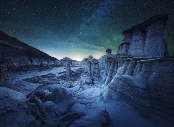 Dit kleine hoekje van de wereld in het zuiden van Utah neemt je mee op een reis terug in de tijd met zijn talloze versteningen en hoodoos. Ongelooflijke rotsformaties en een spookachtige stilte maken van deze plek iets heel bijzonders. Hier met een groene sfeervolle gloed