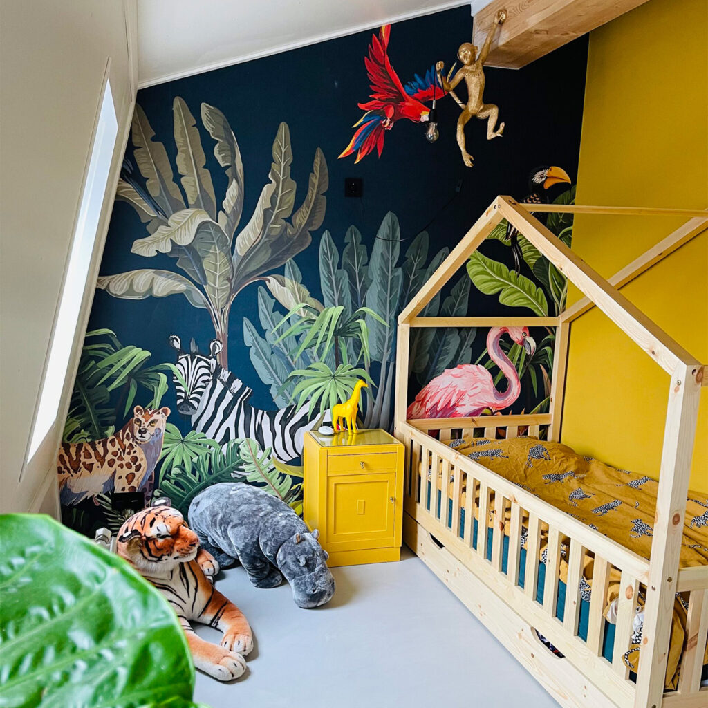 Wat is dit een mooie kinderkamer! Daarom staat deze inzending op nummer 5. Dit behang van een illustratie met verschillende wilde dieren is perfect voor de kinderkamer. Door de zwarte achtergrond vallen de dieren en planten extra goed op.