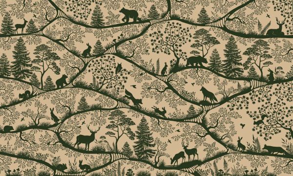 Een stijlvol bosdessin met silhouetten van herten, beren, wolven en konijnen tussen sierlijke boomtakken en fijne natuurdetails. Het diepe mosgroen op een warme beige achtergrond zorgt voor een rustige en natuurlijke uitstraling.