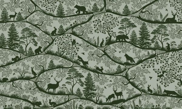 Dit decoratieve patroon brengt de kalmte en schoonheid van het bos op een stijlvolle manier naar binnen. Over de achtergrond slingeren organische boomtakken die samen een harmonieus ritme vormen. Tussen de takken verschijnen silhouetten van diverse bosdieren, zoals statige herten, krachtige beren, waakzame wolven en speelse konijnen. Fijne illustraties van dennenbomen, bladeren, varens en vogels zorgen voor een rijk en levendig detailniveau. Het contrast tussen het diepe groen en de zachte groengrijze ondergrond geeft het dessin een natuurlijke diepte en een moderne uitstraling.