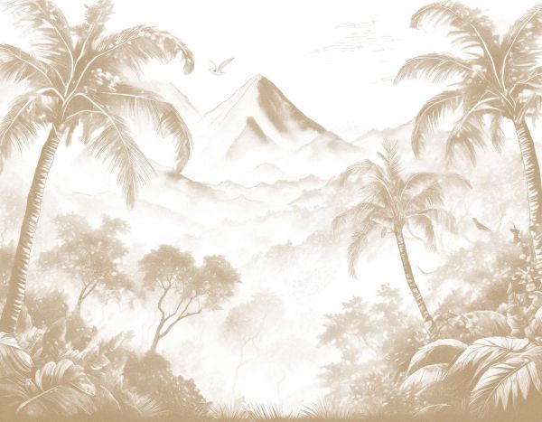 Dit design portretteert een vredig, vulkanisch eiland, verlicht door het zachte licht van de ochtendzon. Palmbomen wiegen zachtjes in de wind, en de verre berg torent hoog uit boven een nevelig, weelderig bos.