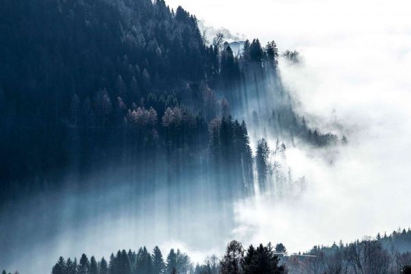 Zacht gefilterd zonlicht werpt lange stralen door een mistig naaldbos op een berghelling. Koele blauwtinten vermengen zich met het witte nevellicht en creëren een mysterieuze, serene sfeer.