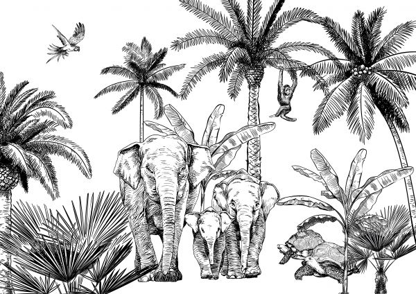 Olifanten en zijn jungle vrienden in het bos. Hip en Trendy behang voor kinderkamers.