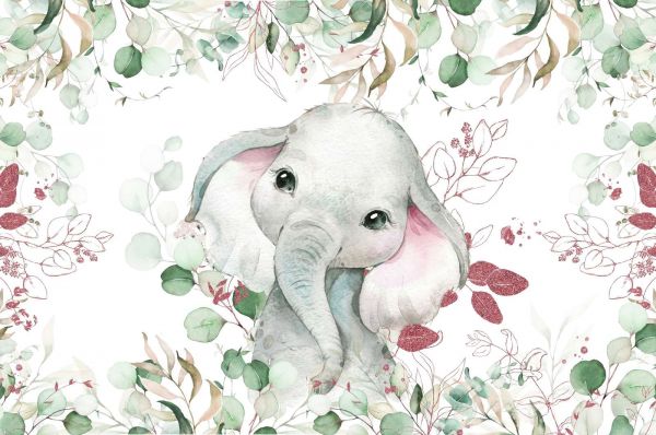 Prachtig behang met een baby olifant in een decor van mint, eucalyptus en roze gebladerte.
