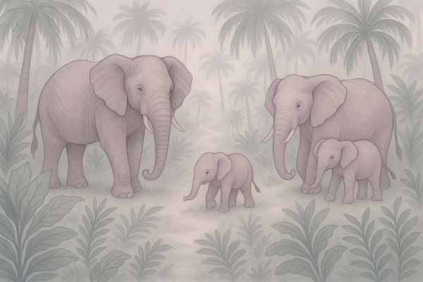Een liefdevolle olifantenfamilie wandelt door een zachte, mistige jungle vol palmen en bladeren. De warme grijstinten en subtiele vormen geven een rustgevende en tedere sfeer die perfect is voor een serene kinderkamer.
