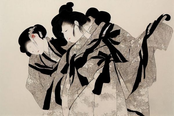 Een mooie abstracte illustratie van Oosterse vrouwen op een beige achtergrond.