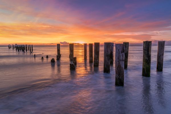 Een mooie afbeelding van een oranje paarse zee tijdens zonsondergang met paalhoofden.