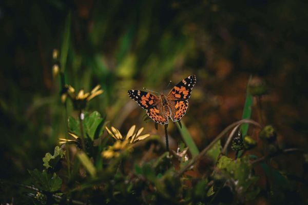 Deze betoverende scène toont een oranje vlinder die elegant balanceert op een dunne bloemstengel, omringd door wilde begroeiing. De warme tinten van de vleugels contrasteren prachtig met de diepe groenen en donkere achtergrond. Het spel van licht en schaduw geeft het beeld een intieme en bijna mysterieuze sfeer.