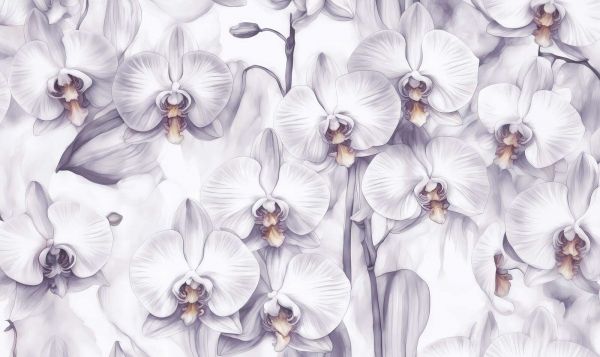 In deze weelderige compositie creëren dieppaarse tinten een opvallend contrast met de helderwitte orchideeën. De gedetailleerde bloemblaadjes lijken te glanzen tegen de diepe achtergrond, terwijl subtiele lila accenten in de bladeren en stengels voor een zachte overgang zorgen.