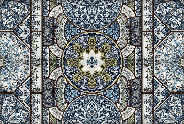 Deze compositie toont een verfijnd tegelpatroon met grote ronde mandala’s als centraal element, omringd door geometrische kaders en sierlijke florale motieven. Het kleurenschema bestaat uit diep indigo, helder wit, olijfgroen en warme bruintinten, wat zorgt voor een krachtig maar harmonieus contrast. De herhalende symmetrie en de gedetailleerde krullen geven het geheel een ambachtelijke en bijna historische uitstraling, geïnspireerd op traditionele mediterrane en oosterse tegelkunst.