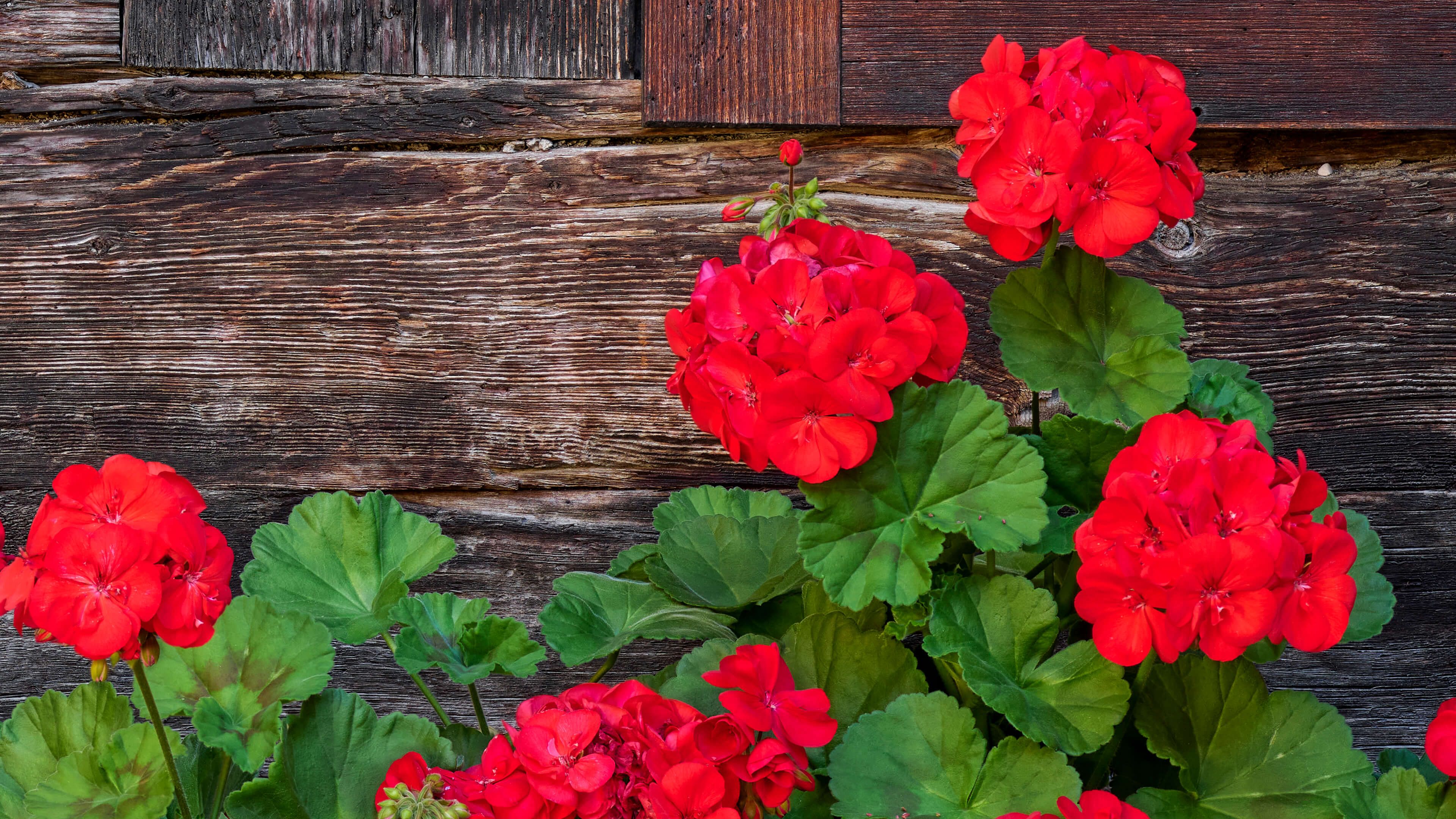 Oud hout met rode bloemen. De rode bloemen die tegen het houten huisje aan staan geven een vrolijke uitstraling aan dit fotobehang.
