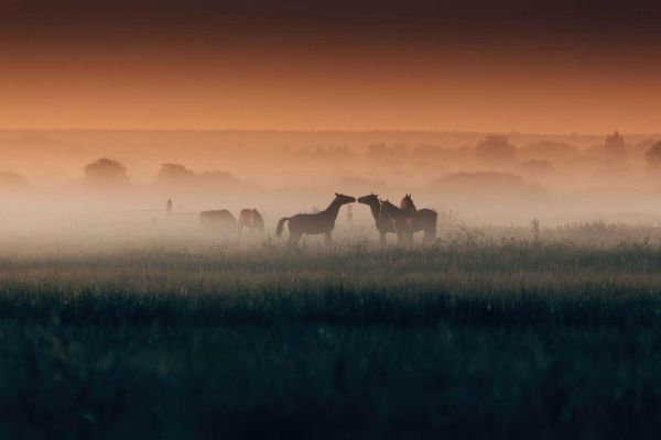 Een groep paarden staat vredig in een mistige weide, badend in zacht oranje ochtendlicht. De lucht en nevel vloeien samen tot een sfeervol landschap vol rust en dromerigheid.